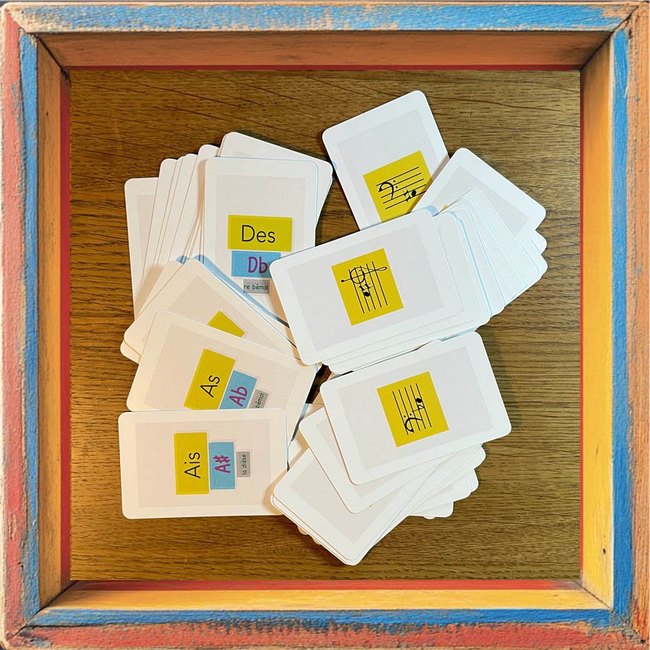 Enharmonika is a card game that helps to understand the principle of alteration. It is an educational game suitable for children from the age of six. It can be played in by two persons as well as in small groups of up to four people. It is important that a teacher or another musically educated person is present. It should be played directly at the piano. At the end of the game, the winner should play the collected notes on the piano. Of course it can also be a keyboard, xylophone or other musical instrument. In any case the listening experience is very important.